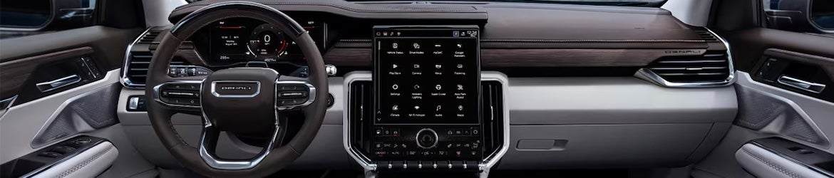 The cabin showcases a 15-inch premium GMC infotainment system and 11-inch digital driver display. The Denali adds leather-appointed first- and second-row seats plus heated and ventilated front seats. An optional panoramic sunroof floods the interior with natural light.